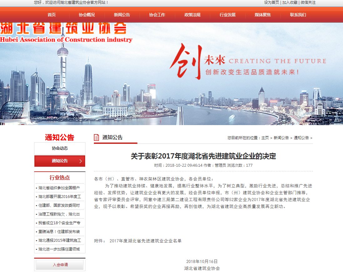 關(guān)于表彰2017年度湖北省先進(jìn)建筑業(yè)企業(yè)的決定